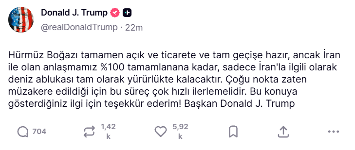 Trump, "Hürmüz Boğazı tamamen açık ve ticarete ve tam geçişe hazır, ancak İran ile olan anlaşmamız %100 tamamlanana kadar, sadece İran'la ilgili olarak deniz ablukası tam olarak yürürlükte kalacaktır. Çoğu nokta zaten müzakere edildiği için bu süreç çok hızlı ilerlemelidir." diye ekledi.
