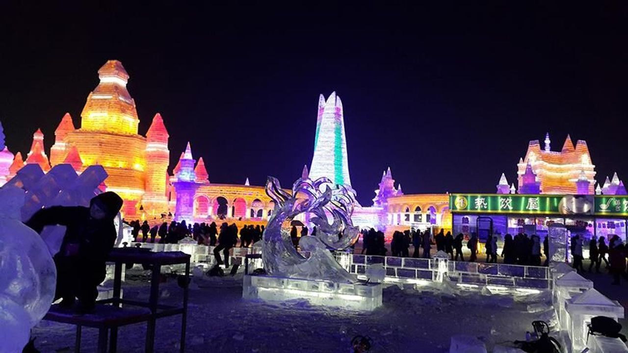 Çin'in kuzeydoğusundaki Heilongjiang eyaletinin merkezi Harbin'de bulunan, dünyanın en büyük buz ve kar temalı parkı Harbin Kar ve Buz Dünyası'nı ziyaret eden turistler, 18 Ocak 2026. (Fotoğraf: Wang Jianwei/Xinhua)
